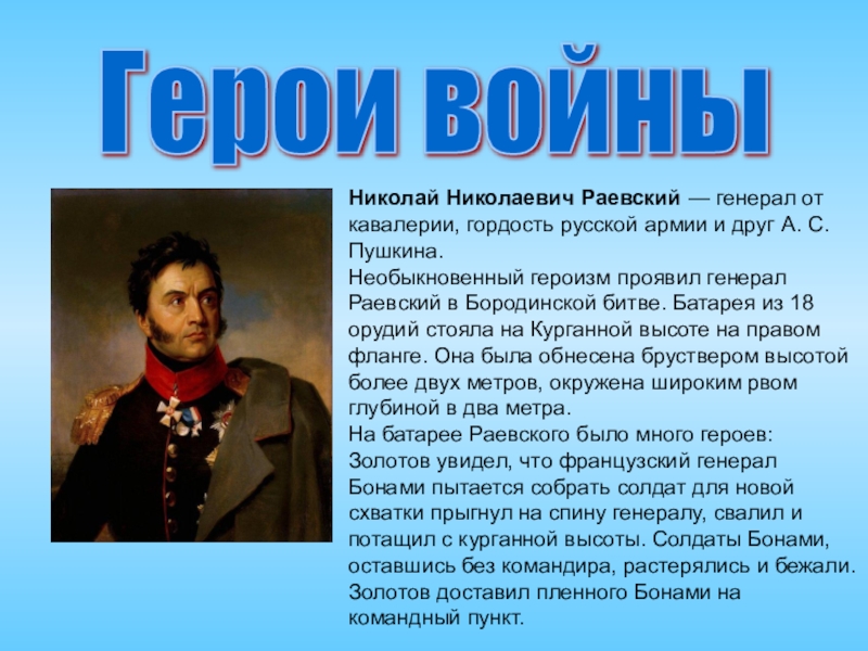 вглубь страны. Дальнейший отход подразумевал сдачу Москвы без боя, что было недопустимо как с политической, так и с моральной точки зрения. Получив незначительные подкрепления, Кутузов решился дать Наполеону генеральное сражение, первое и единственное в Отечественной войне 1812 года. Бородинское сражениеБольшое превосходство противника в силах и отсутствие резервов вынудили Кутузова отступать вглубь страны. Дальнейший отход подразумевал сдачу Москвы без боя, что было недопустимо как с политической, так и с моральной точки зрения. Получив незначительные подкрепления, Кутузов решился дать Наполеону генеральное сражение, первое и единственное в Отечественной войне 1812 года. Бородинское сражение, одна из крупнейших битв эпохи наполеоновских войн, произошло 26 августа (7 сентября). За день боя русская армия нанесла тяжёлые потери французским войскам, но и сама к ночи того же дня потеряла почти половину своих войск. Кутузов принял решение отойти с бородинской позиции, а затем, после совещания в ФиляхБольшое превосходство противника в силах и отсутствие резервов вынудили Кутузова отступать вглубь страны. Дальнейший отход подразумевал сдачу Москвы без боя, что было недопустимо как с политической, так и с моральной точки зрения. Получив незначительные подкрепления, Кутузов решился дать Наполеону генеральное сражение, первое и единственное в Отечественной войне 1812 года. Бородинское сражение, одна из крупнейших битв эпохи наполеоновских войн, произошло 26 августа (7 сентября). За день боя русская армия нанесла тяжёлые потери французским войскам, но и сама к ночи того же дня потеряла почти половину своих войск. Кутузов принял решение отойти с бородинской позиции, а затем, после совещания в Филях (ныне район Москвы), оставил Москву. Тем не менее русская армия показала себя достойно при БородинеБольшое превосходство противника в силах и отсутствие резервов вынудили Кутузова отступать вглубь страны. Дальнейший отход подразумевал сдачу Москвы без боя, что было недопустимо как с политической, так и с моральной точки зрения. Получив незначительные подкрепления, Кутузов решился дать Наполеону генеральное сражение, первое и единственное в Отечественной войне 1812 года. Бородинское сражение, одна из крупнейших битв эпохи наполеоновских войн, произошло 26 августа (7 сентября). За день боя русская армия нанесла тяжёлые потери французским войскам, но и сама к ночи того же дня потеряла почти половину своих войск. Кутузов принял решение отойти с бородинской позиции, а затем, после совещания в Филях (ныне район Москвы), оставил Москву. Тем не менее русская армия показала себя достойно при Бородине, за что Кутузов 30 августа (11 сентябряБольшое превосходство противника в силах и отсутствие резервов вынудили Кутузова отступать вглубь страны. Дальнейший отход подразумевал сдачу Москвы без боя, что было недопустимо как с политической, так и с моральной точки зрения. Получив незначительные подкрепления, Кутузов решился дать Наполеону генеральное сражение, первое и единственное в Отечественной войне 1812 года. Бородинское сражение, одна из крупнейших битв эпохи наполеоновских войн, произошло 26 августа (7 сентября). За день боя русская армия нанесла тяжёлые потери французским войскам, но и сама к ночи того же дня потеряла почти половину своих войск. Кутуз