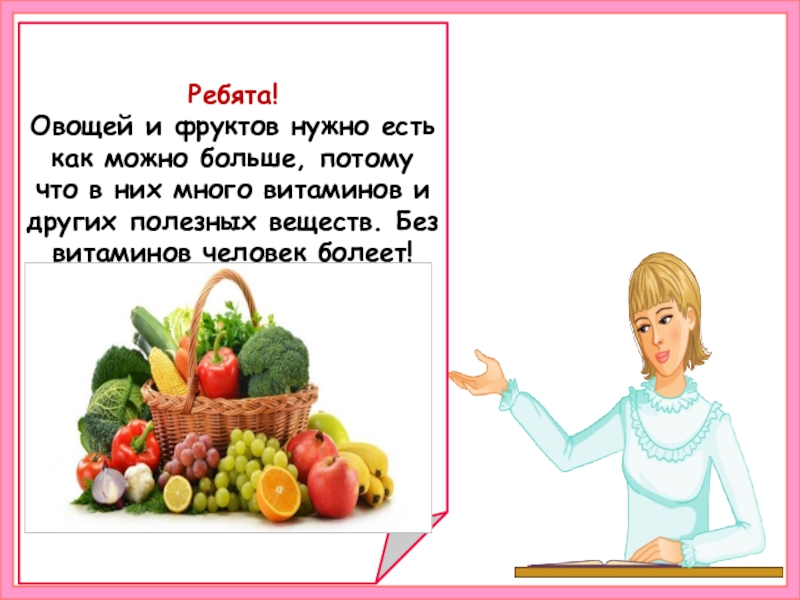 Ребята!Овощей и фруктов нужно есть как можно больше, потому что в них много витаминов и других полезных