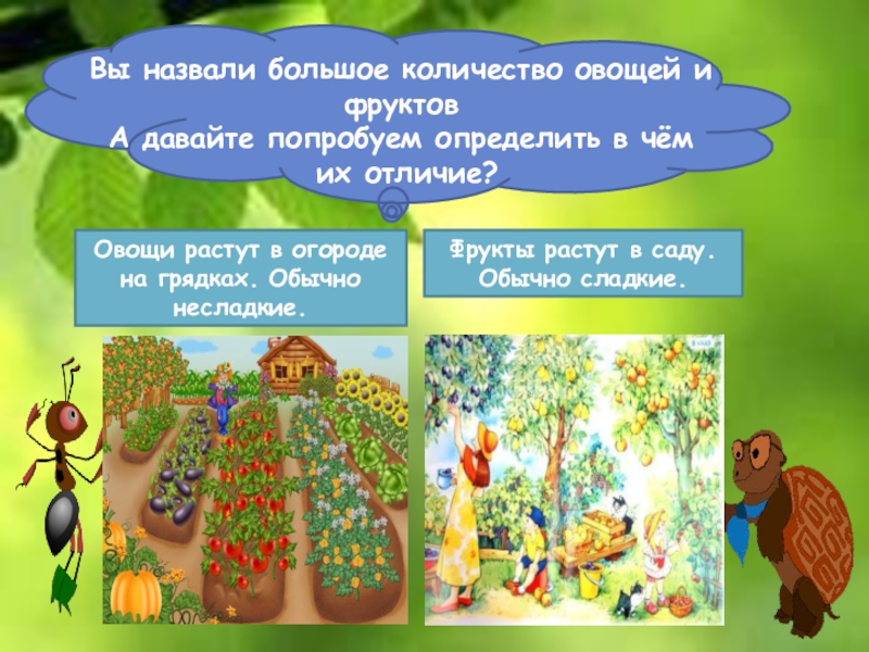 Овощи растут в огороде на грядках. Обычно несладкие.Фрукты растут в саду.Обычно сладкие.