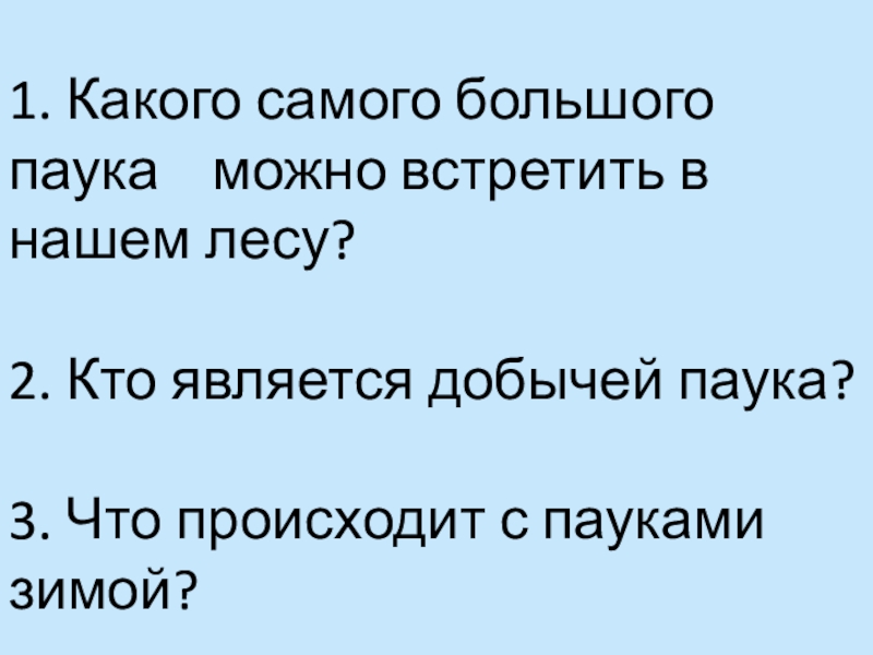 1. Какого самого большого паука  можно встретить в нашем лесу?2. Кто является добычей паука?3. Что происходит
