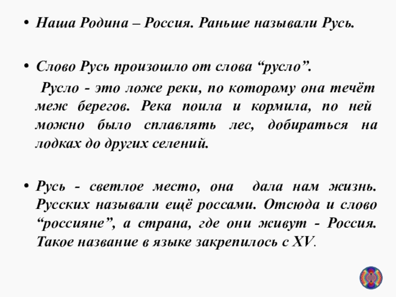 Наша Родина – Россия. Раньше называли Русь. Слово Русь произошло от слова “русло”. 	Русло - это ложе