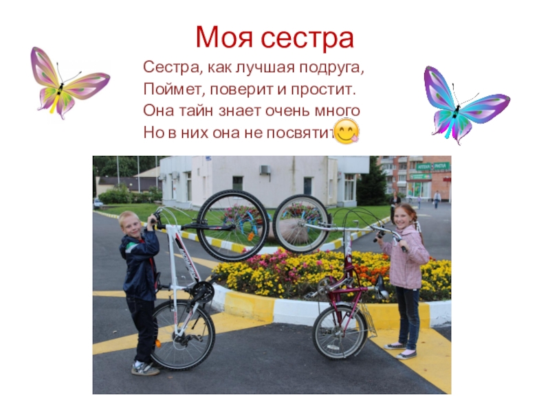 Моя сестраСестра, как лучшая подруга, Поймет, поверит и простит. Она тайн знает очень много Но в них она не посвятит!