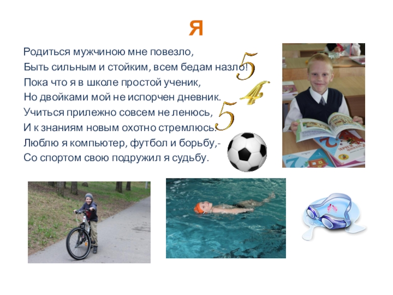 ЯРодиться мужчиною мне повезло,Быть сильным и стойким, всем бедам назло!Пока что я в школе простой ученик,Но двойками