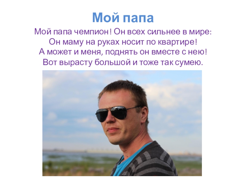 Мой папаМой папа чемпион! Он всех сильнее в мире:Он маму на руках носит по квартире! А может