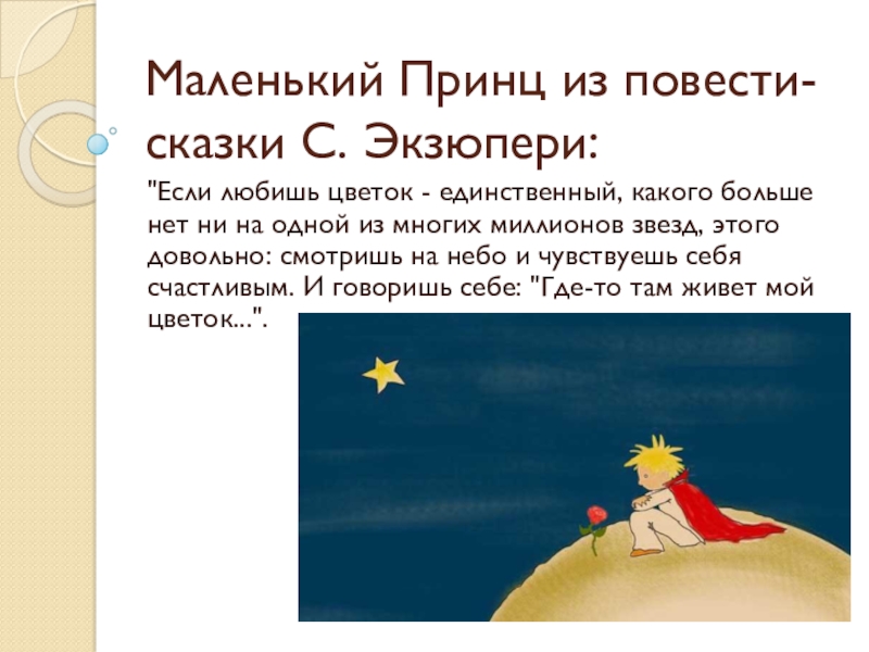 какого больше нет ни на одной из многих миллионов звезд, этого довольно: смотришь на небо и чувствуешь себя счастливым. И говоришь себе: "Где-то там живет мой цветок...".