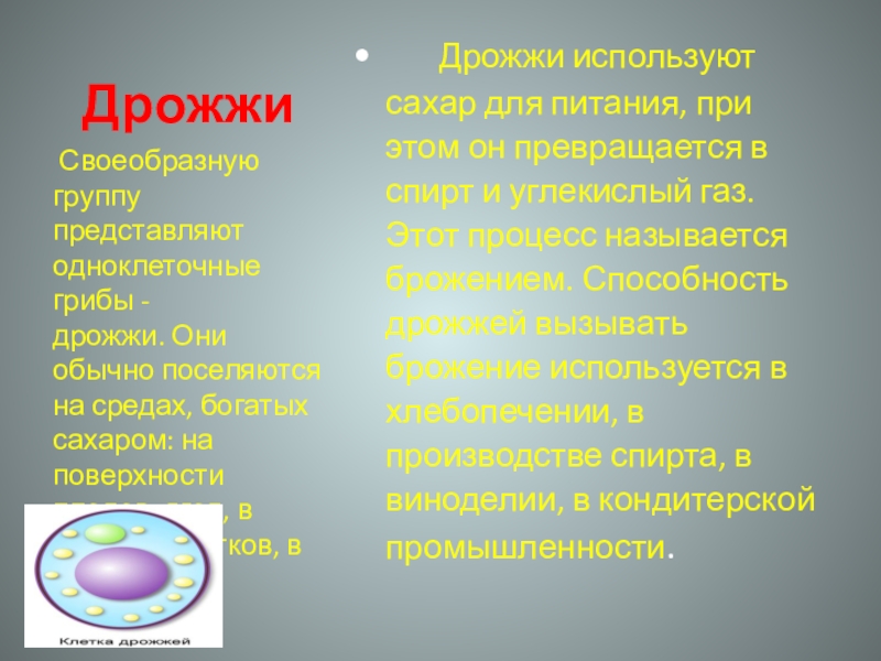 Своеобразную группу представляют одноклеточные грибы - дрожжи. Они обычно поселяются на средах, богатых сахаром: на поверхности плодов, ягод, в нектаре цветков, в тесте.