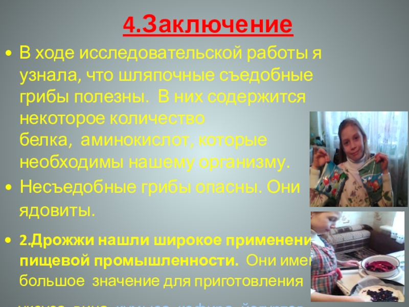В ходе исследовательской работы я узнала, что шляпочные съедобные грибы полезны.