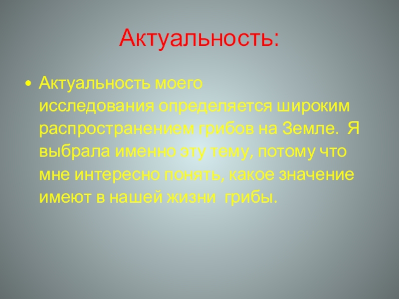 Актуальность моего исследования определяется широким распространением грибов на Земле. Я выбрала именно эту