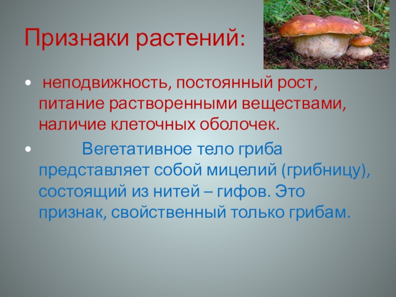 неподвижность, постоянный рост, питание растворенными веществами, наличие клеточных оболочек.