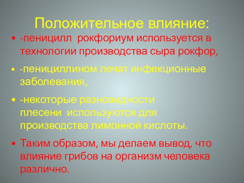 Таким образом, мы делаем вывод, что влияние грибов на организм человека различно.