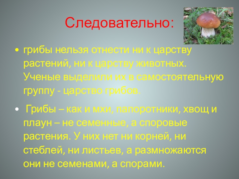 Грибы – как и мхи, папоротники, хвощ и плаун – не семенные, а споровые растения. У них нет ни корней, ни стеблей, ни листьев, а размножаются они не семенами, а спорами.