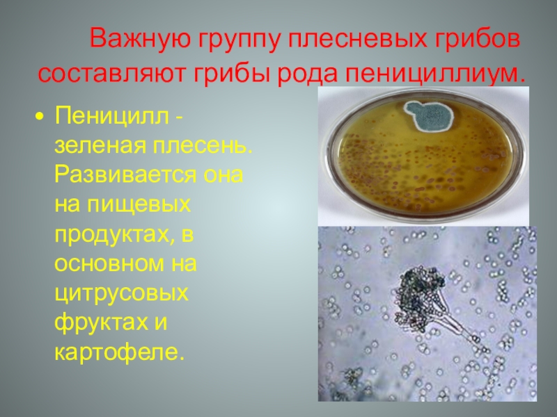 Пеницилл - зеленая плесень. Развивается она на пищевых продуктах, в основном на цитрусовых фруктах и картофеле.