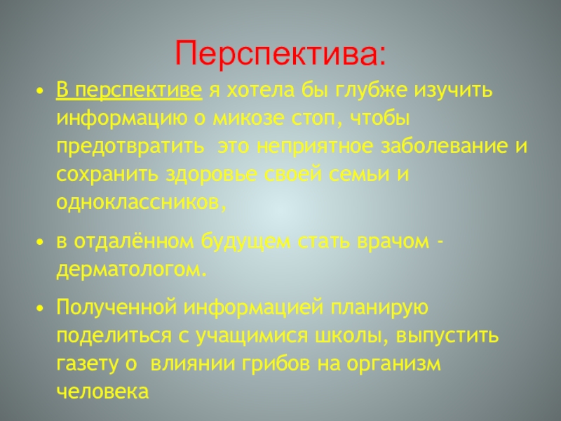 В перспективе я хотела бы глубже изучить информацию о микозе стоп,