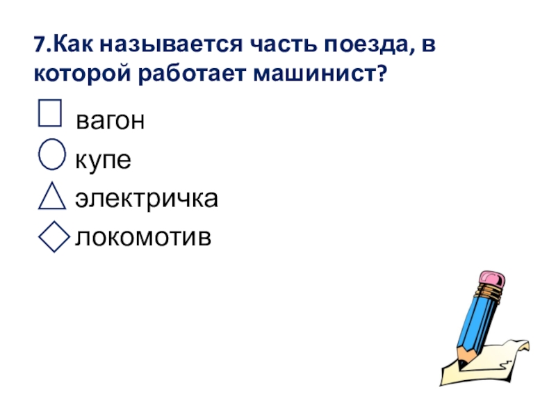 7.Как называется часть поезда, в которой работает машинист?     вагон    купе