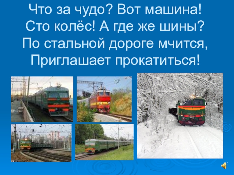 Что за чудо? Вот машина! Сто колёс! А где же шины? По стальной дороге мчится, Приглашает прокатиться!