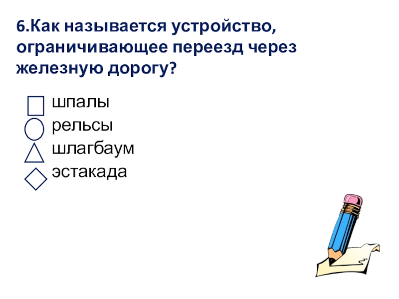 Слайд 166.Как называется устройство, ограничивающее переезд через железную дорогу?