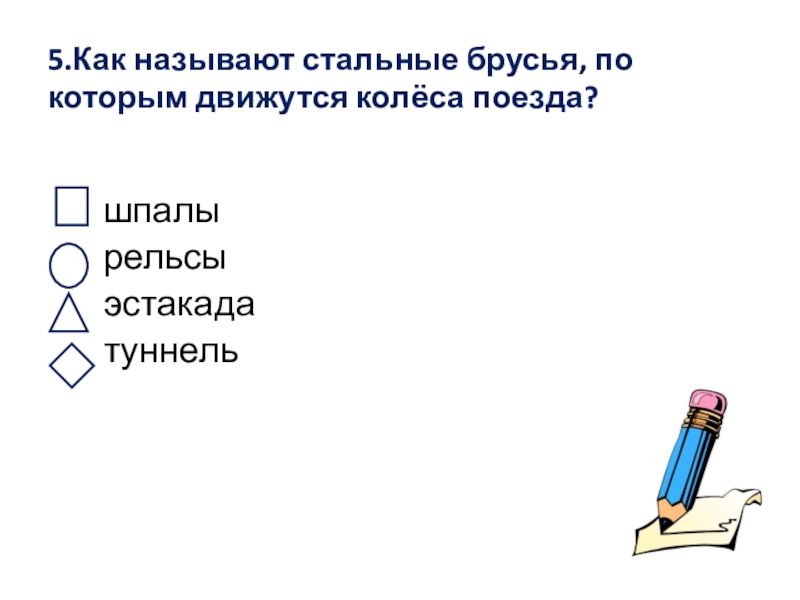 5.Как называют стальные брусья, по которым движутся колёса поезда?       шпалы