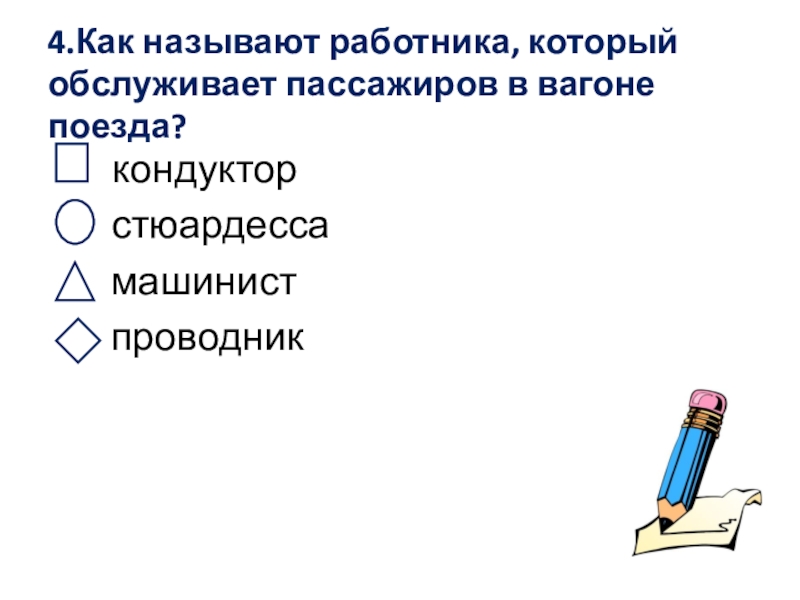 Слайд 144.Как называют работника, который обслуживает пассажиров в вагоне поезда?
