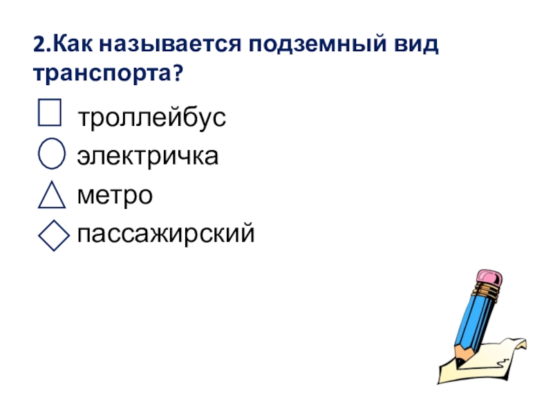 2.Как называется подземный вид транспорта?     троллейбус    электричка