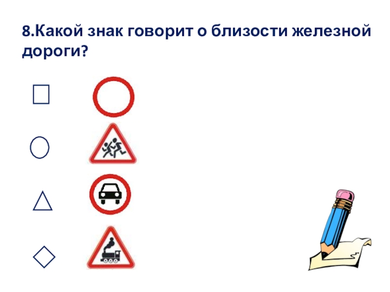 Слайд 188.Какой знак говорит о близости железной дороги?