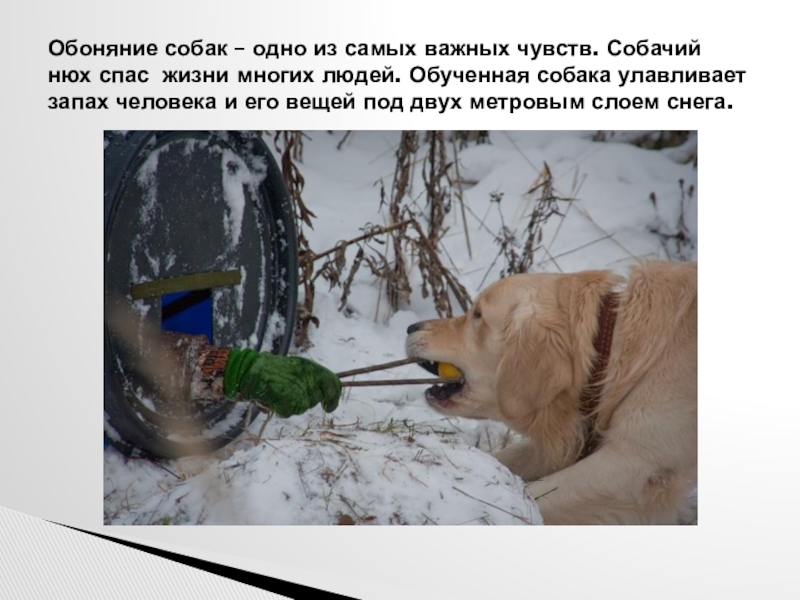 жизни многих людей. Обученная собака улавливает запах человека и его вещей под двух метровым слоем снега.