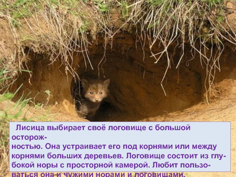 Слайд 46 Лисица выбирает своё логовище с большой осторож-
