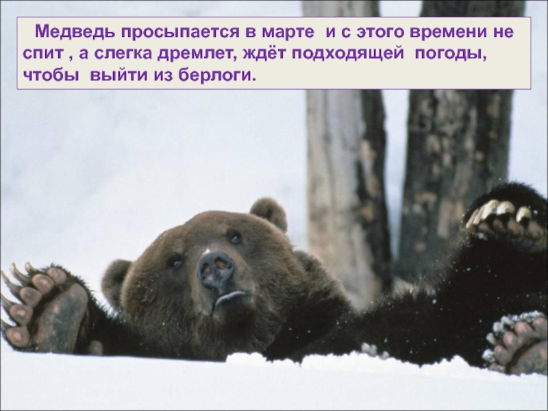 Слайд 5 Медведь просыпается в марте и с этого времени не