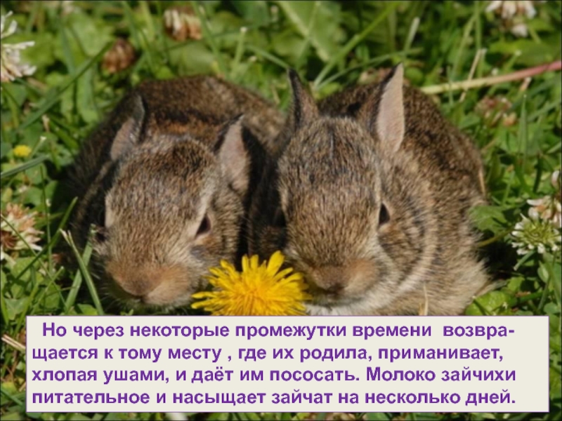 где их родила, приманивает, хлопая ушами, и даёт им пососать. Молоко зайчихи питательное и насыщает зайчат на несколько дней.