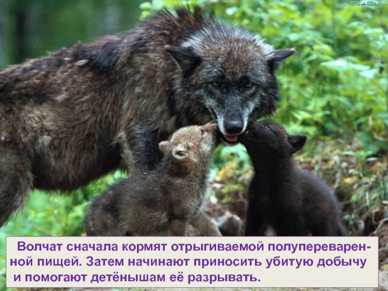 Слайд 32 Волчат сначала кормят отрыгиваемой полупереварен-