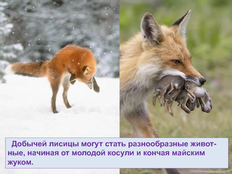 Слайд 48 Добычей лисицы могут стать разнообразные живот-ные, начиная от молодой