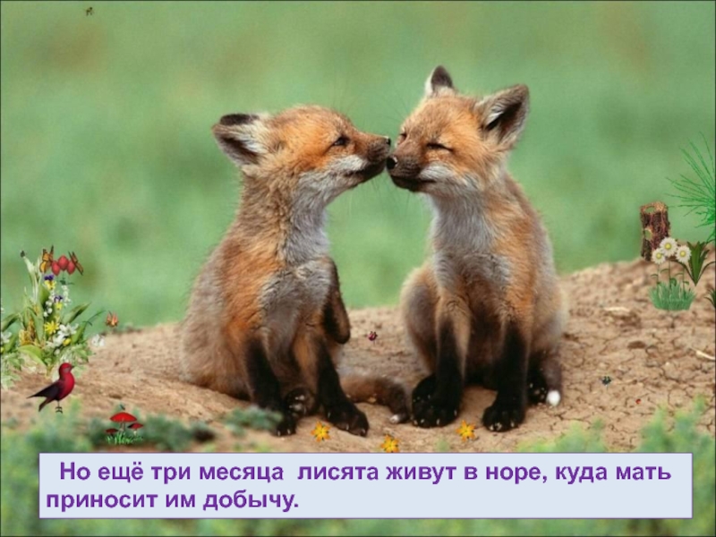 Слайд 52 Но ещё три месяца лисята живут в норе, куда мать