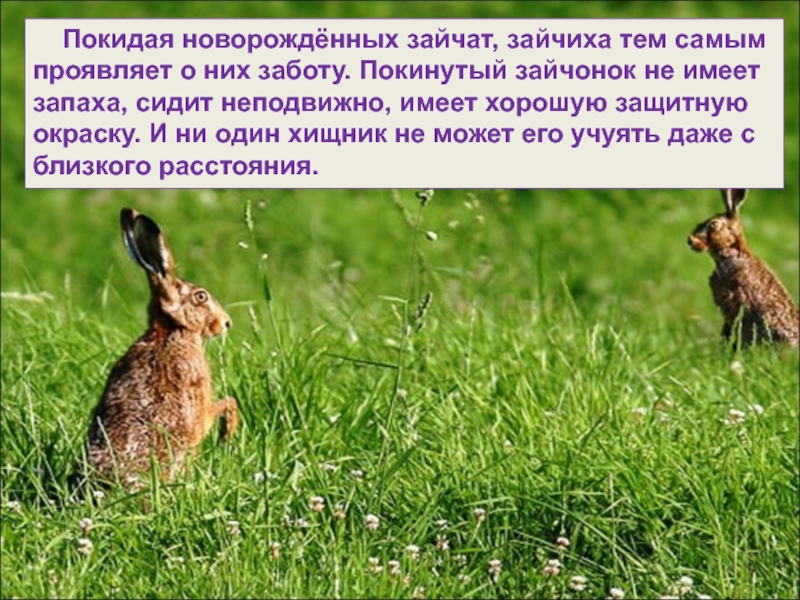 Слайд 23 Покидая новорождённых зайчат, зайчиха тем самым