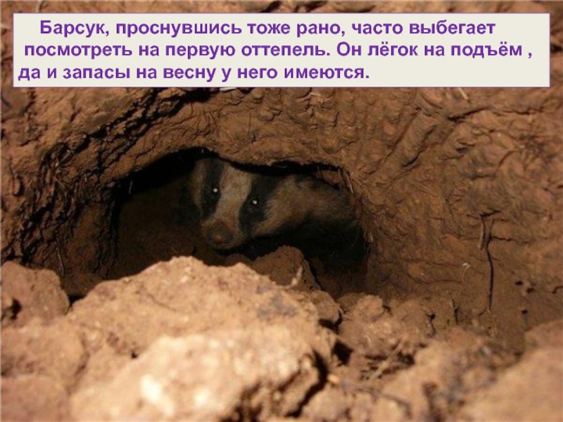 Слайд 6 Барсук, проснувшись тоже рано, часто выбегает