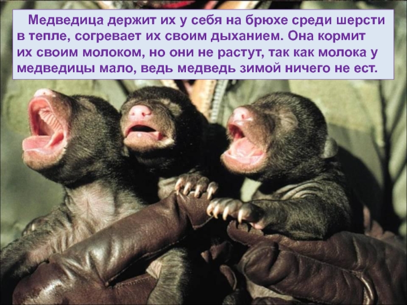 Слайд 39 Медведица держит их у себя на брюхе среди шерсти