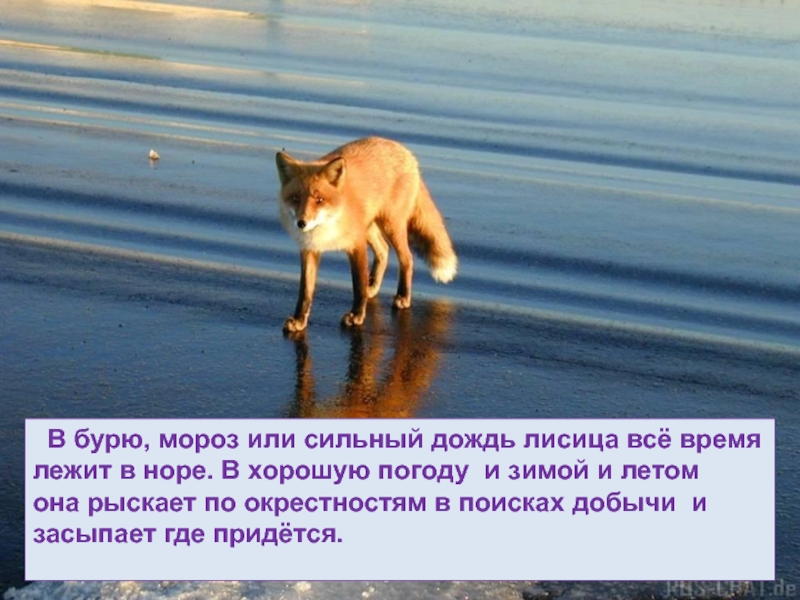 Слайд 47 В бурю, мороз или сильный дождь лисица всё время
