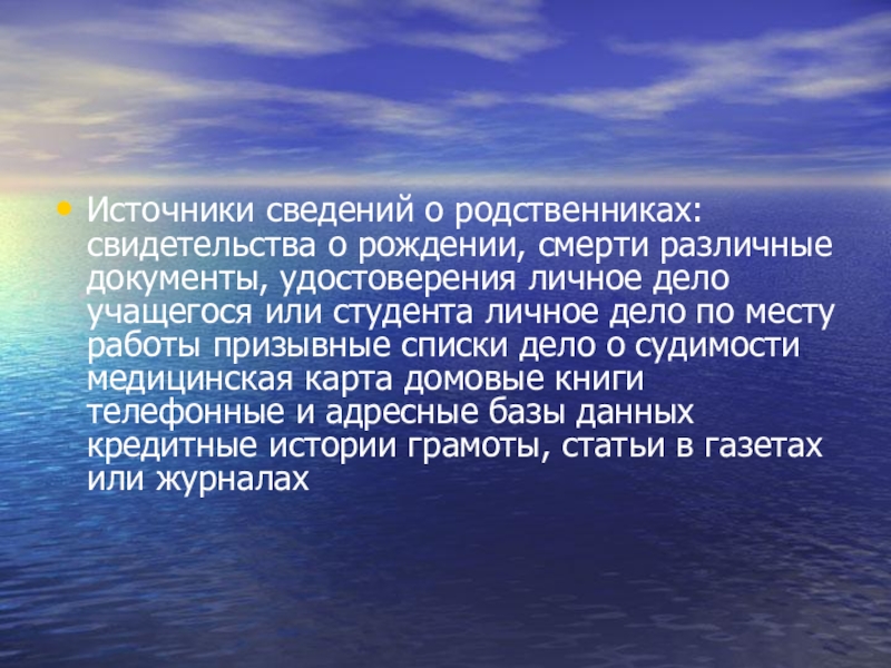 личное дело учащегося или студента личное дело по месту работы призывные списки дело о судимости медицинская карта домовые книги телефонные и адресные базы данных кредитные истории грамоты, статьи в газетах или журналах
