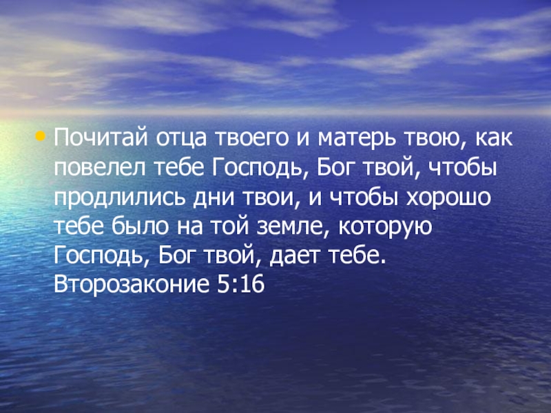 Почитай отца твоего и матерь твою, как повелел тебе Господь, Бог твой, чтобы продлились дни твои, и чтобы хорошо тебе было на той земле, которую Господь, Бог твой, дает тебе. Второзаконие 5:16