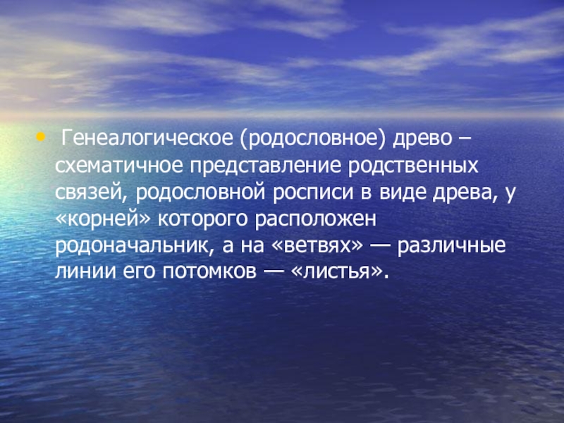 Генеалогическое (родословное) древо – схематичное представление родственных связей, родословной росписи в виде древа, у «корней» которого