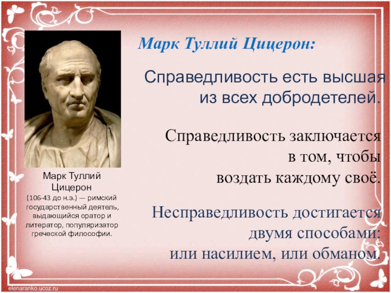 (106-43 до н.э.) — римский государственный деятель, выдающийся оратор и литератор, популяризатор греческой философии.