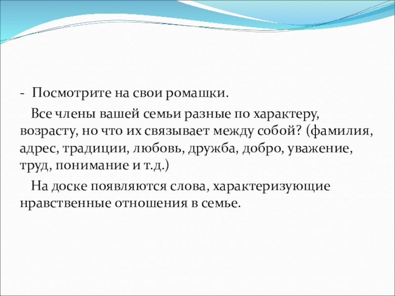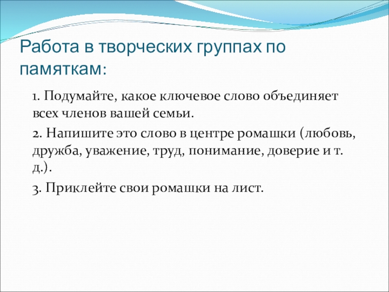 2. Напишите это слово в центре ромашки (любовь, дружба, уважение, труд, понимание, доверие и т.д.).