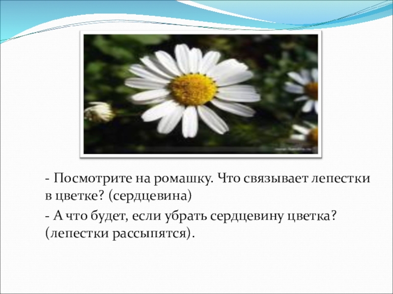 - Посмотрите на ромашку. Что связывает лепестки в цветке? (сердцевина)