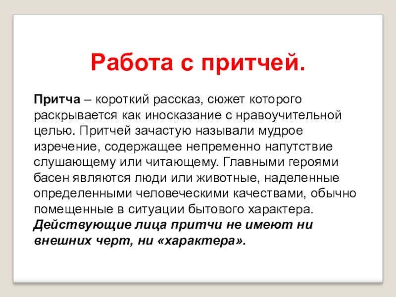 с нравоучительной целью. Притчей зачастую называли мудрое изречение, содержащее непременно напутствие слушающему или читающему. Главными героями басен являются люди или животные, наделенные определенными человеческими качествами, обычно помещенные в ситуации бытового характера. Действующие лица притчи не имеют ни внешних черт, ни «характера».