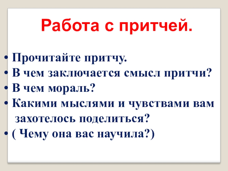Притча – короткий рассказ, сюжет которого раскрывается как иносказание
