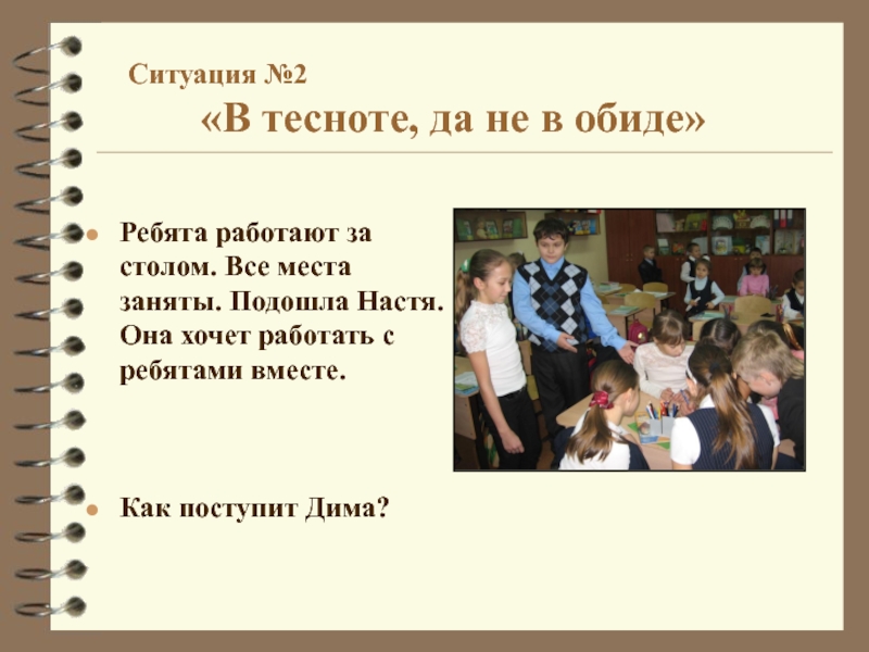 Ребята работают за столом. Все места заняты. Подошла Настя. Она хочет работать с ребятами вместе.