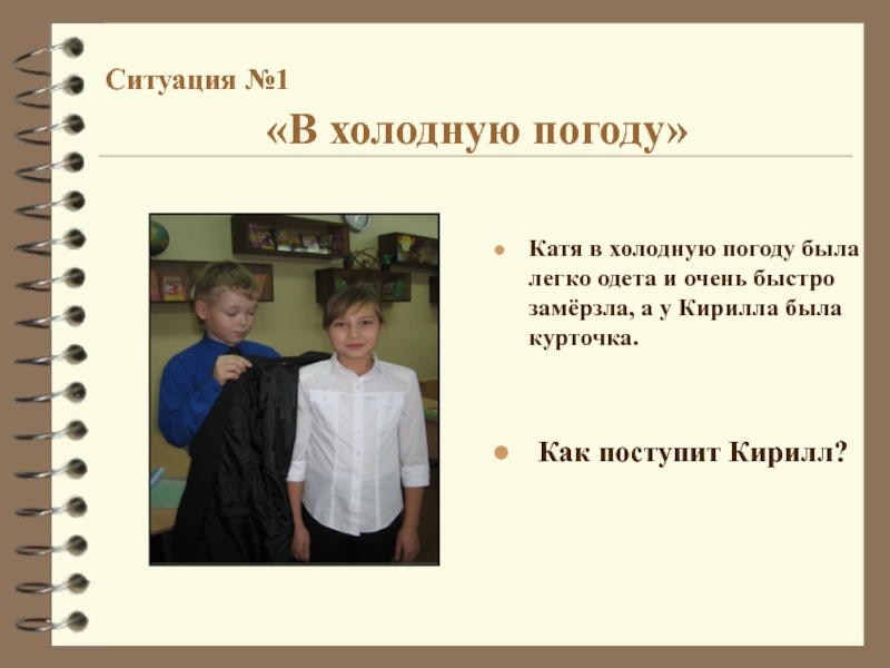 Катя в холодную погоду была легко одета и очень быстро замёрзла, а у Кирилла была курточка.