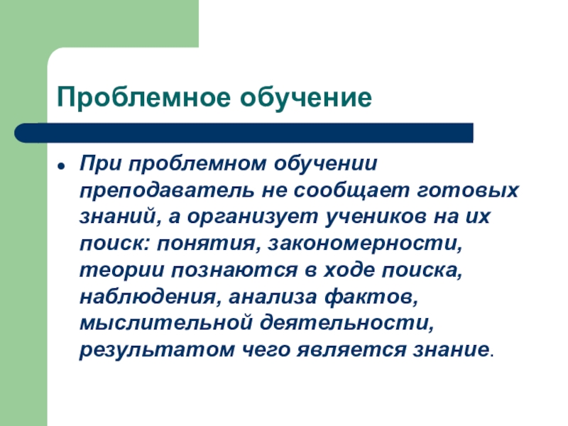 организует учеников на их поиск: понятия, закономерности, теории познаются в ходе поиска, наблюдения, анализа фактов, мыслительной деятельности, результатом чего является знание.