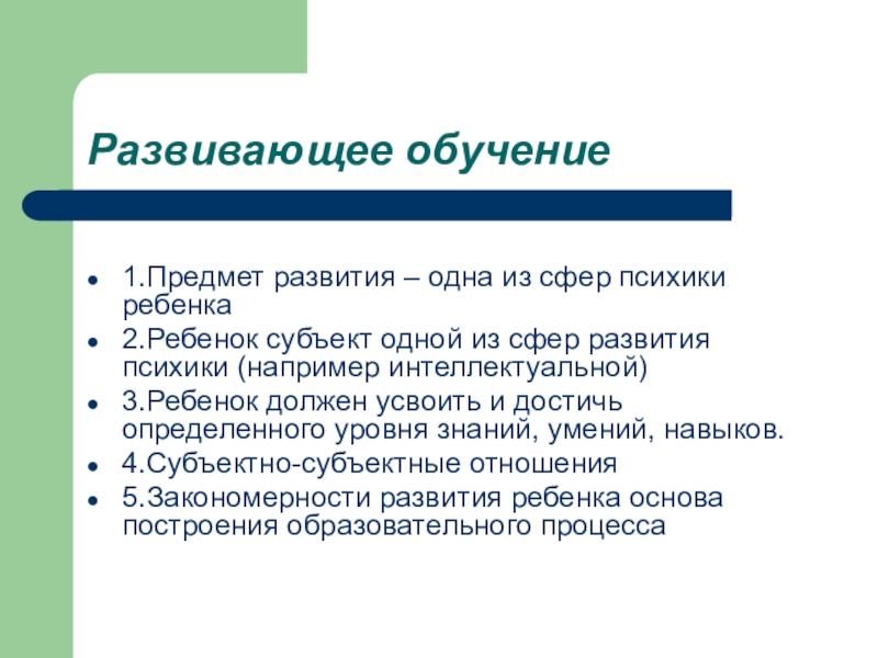 Ученик рассматривается не как объект, а как самоизменяющийся субъект учения. Знания, умения и навыки − лишь средство развития ученика, а не самоцель.