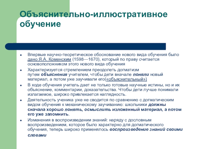 Характеризуется стремлением преодолеть догматизм путем объяснения учителем, чтобы дети вначале поняли новый материал, а потом уже заучивали его(«объяснительный»)