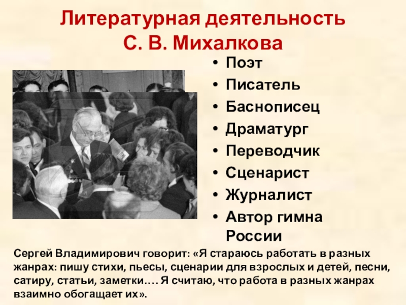 Сергей Владимирович говорит: «Я стараюсь работать в разных жанрах: пишу стихи, пьесы, сценарии для взрослых и детей, песни, сатиру, статьи, заметки.… Я считаю, что работа в разных жанрах взаимно обогащает их».