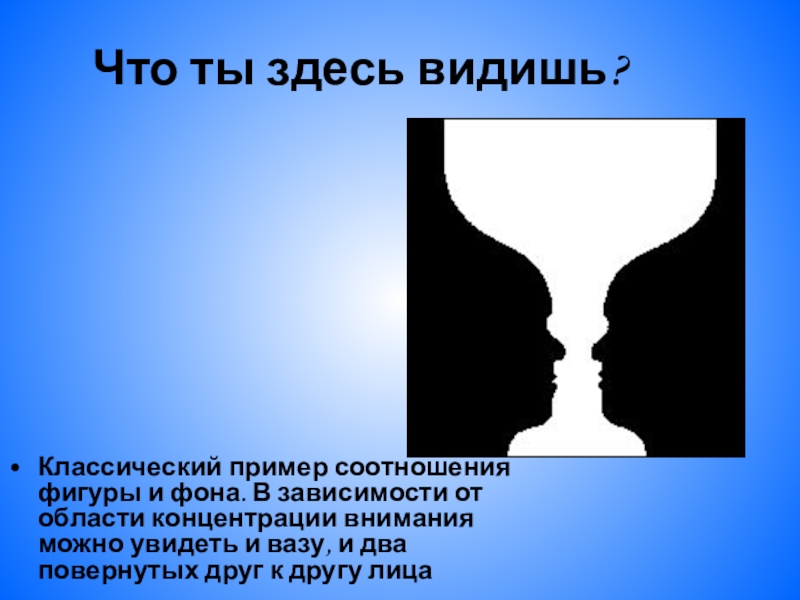 Что ты здесь видишь? Классический пример соотношения фигуры и фона. В зависимости от области концентрации внимания можно